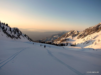 Yesterday, Sam, Bart, Andy, and I got out for a version of the Super Tour. We got a late start in order to accommodate my morning soccer game schedule. I think it worked out for everyone: Andy has been skiing like there is no tomorrow and probably needed the rest; Sam had just flown in from Okinawa on Friday; and Bart has been spending lots of energy remodeling his house. The nice thing about spring touring is that it doesn't get dark until 8:30 or so. Plus, racing the sun can be fun.